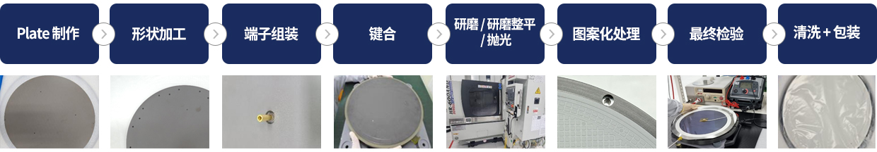 主要材料为 AlN、Al₂O₃ 及复合陶瓷,本公司主要支持寿命到期 ESC 的维修、备用新品制作,或为设备改造及问题改善提供形状 / 结构 / 图案的 Modification。