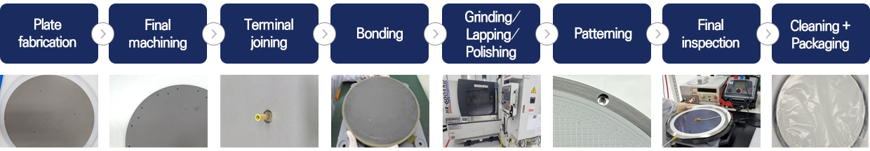 プレート製作 → 形状加工 → 端子接合(ろう付け/はんだ付け 等)→(個別ヒーター層接合)→ 新規プレート接合 → L1工程 |